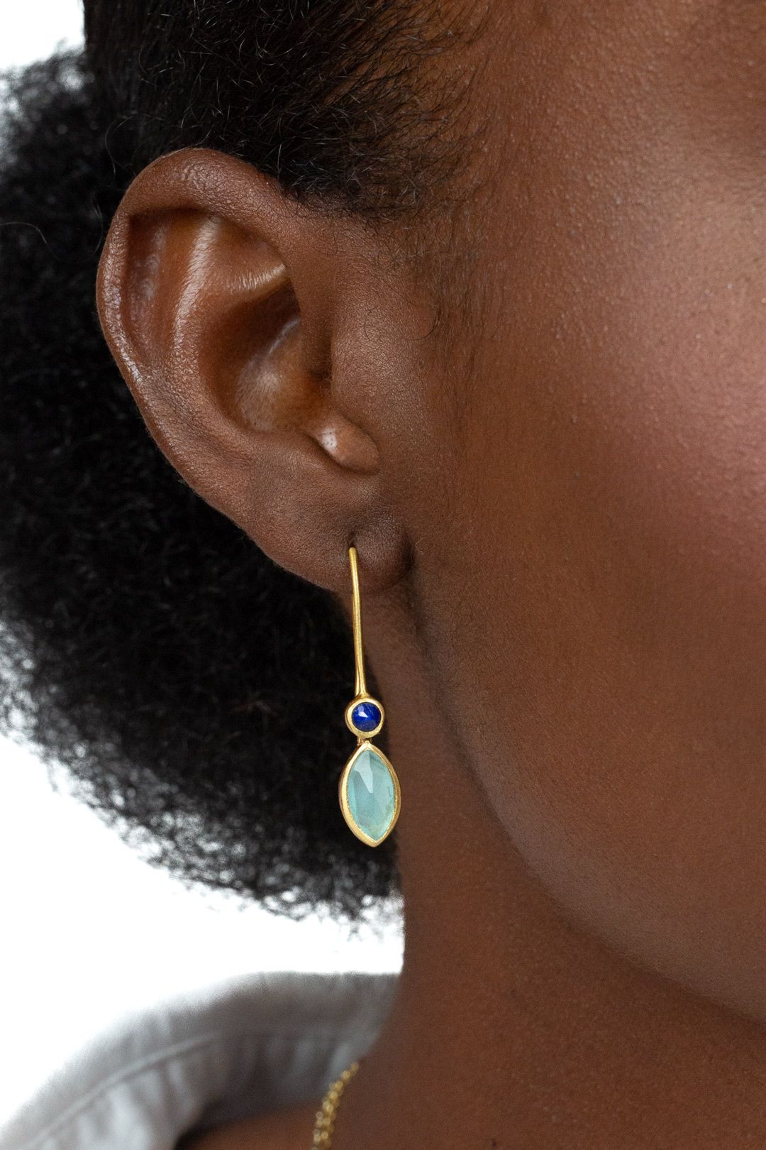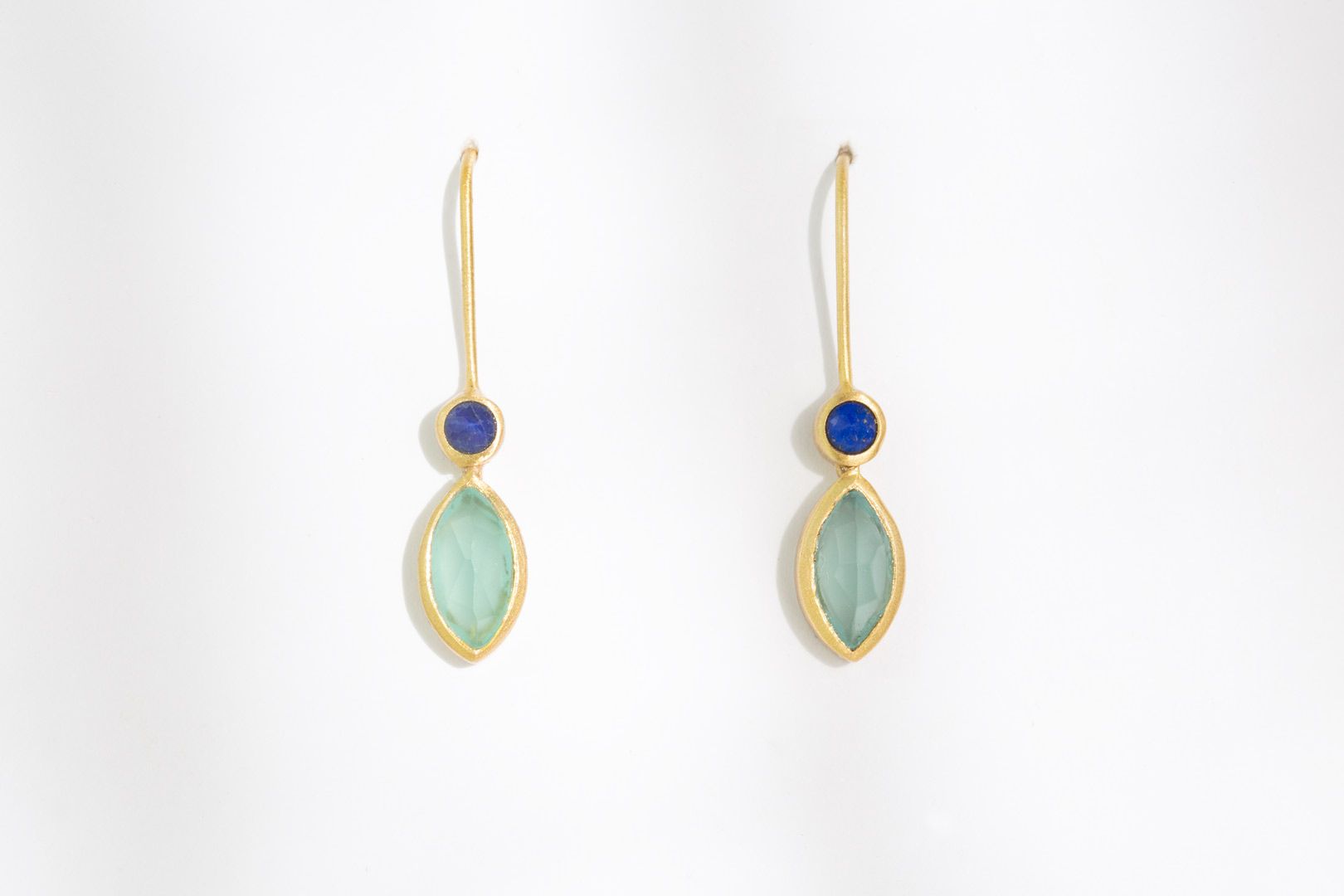 Pedres: Lapislàtzuli i calcedonia aiguamarina. Coure i zinc, lliure de níquel, xapat en or d’1 micra i 18kt sotmès a un lacatge electrolític e-coating.