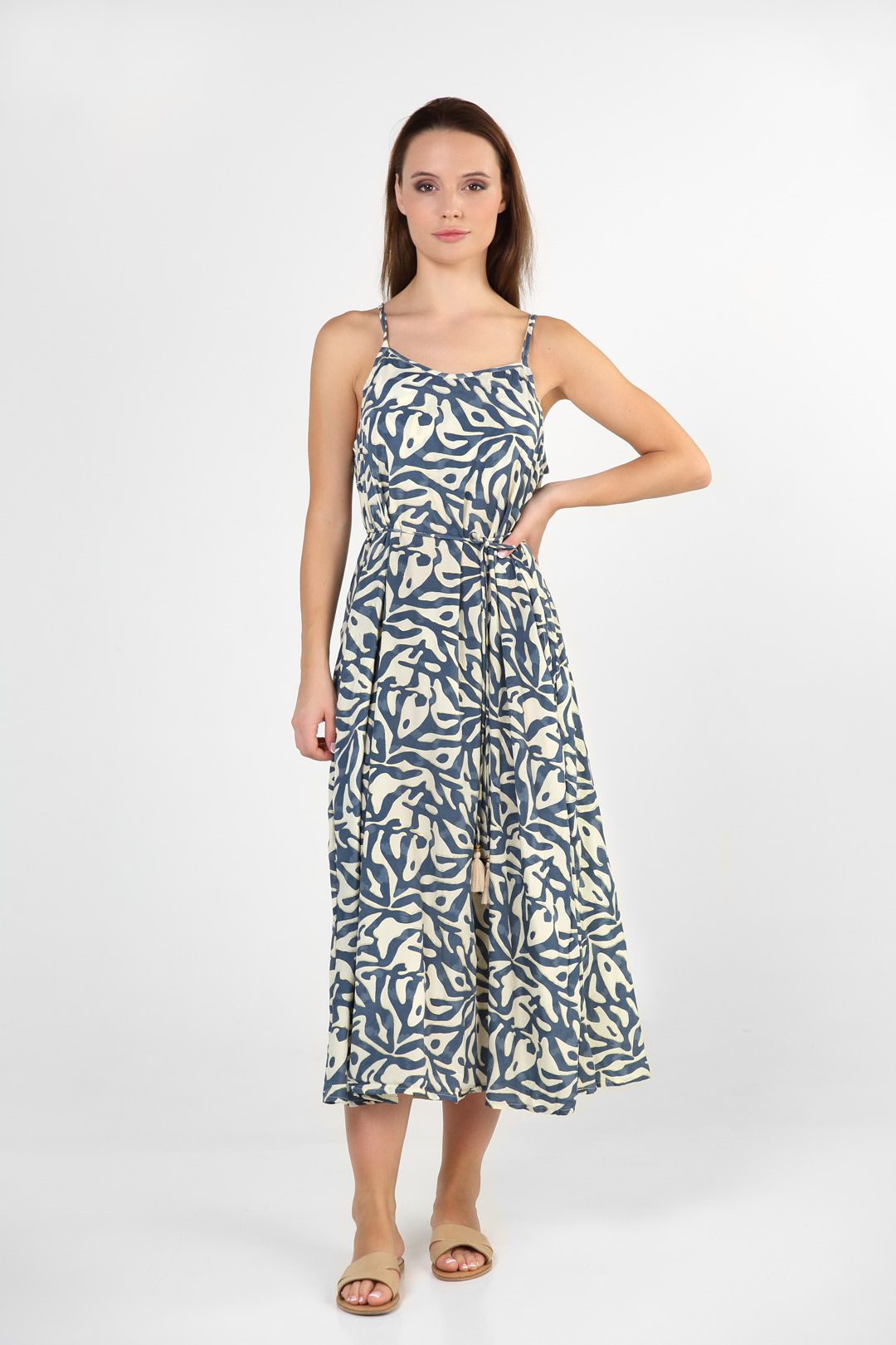 Vestido camisero azul con estampado mediterráneo en lookbook Mandum, estilo bohemio y contemporáneo para inspirar tus outfits.