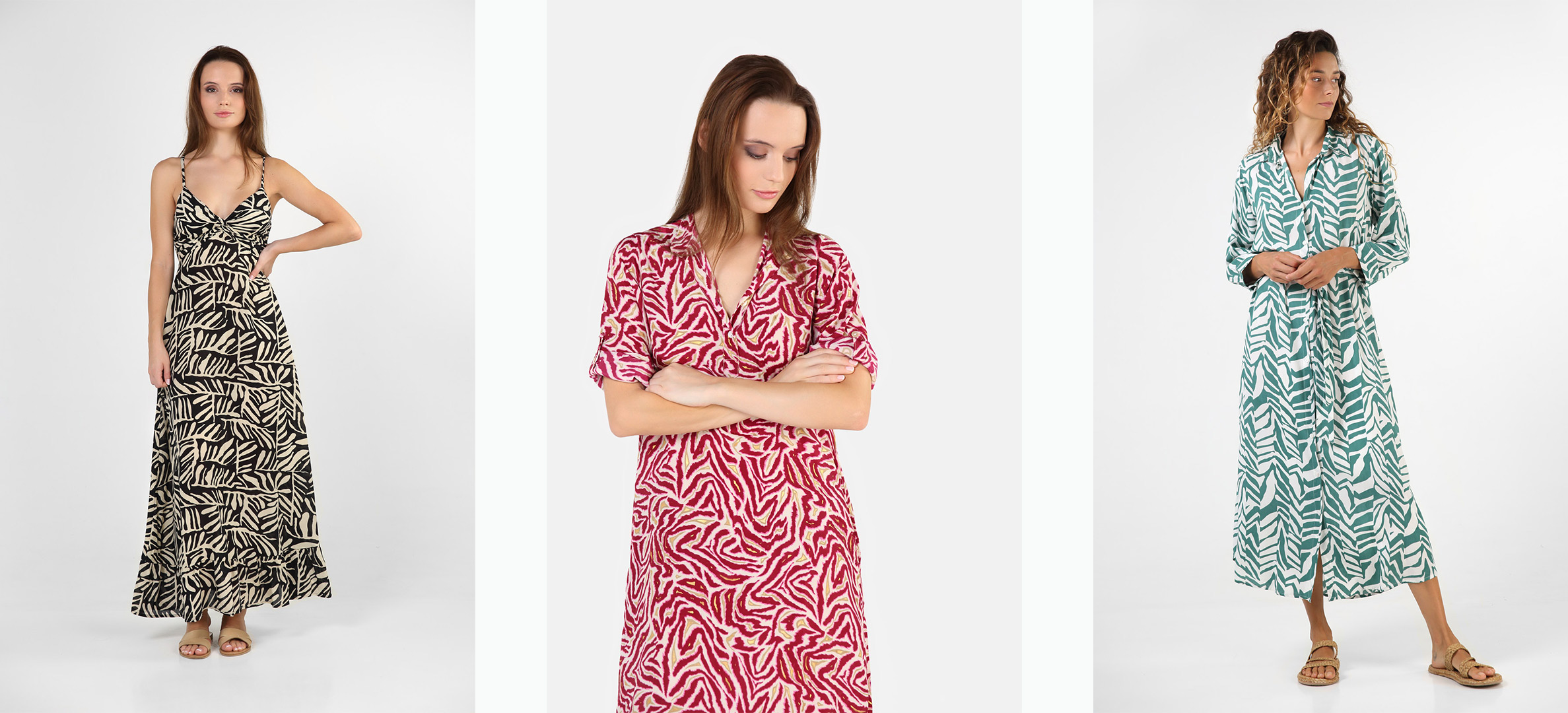 Vestido turquesa con estampado geométrico de inspiración bohemia, look Mandum 2025 con estilo mediterráneo y sostenible.